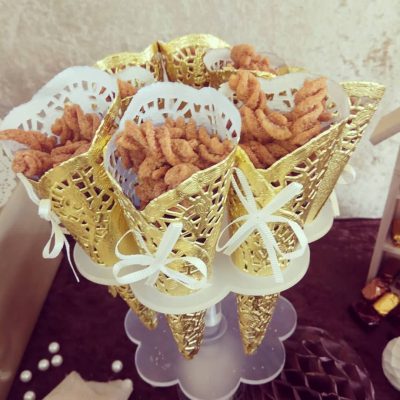 אתחיל במלוח – קניתי מעמד לגביעי גלידה, ובכל חור הנחתי קונוס מוזהב עם פפיון – ממולא בביסלי/במבה/צ’יפס. איך הכנתי את הקונוסים אתן שואלות? נייר תחרה אתן מכירות? אז גילגלתי אותו בצורת קונוס, הדבקתי, ובפרונט הדבקתי פפיון קטן וחמוד.