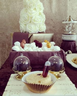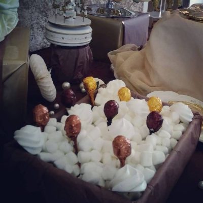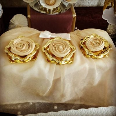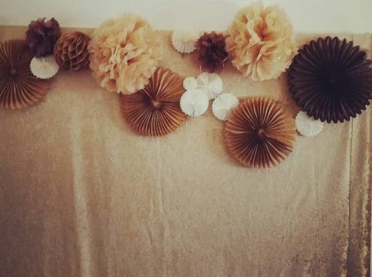 אז איך מתחילים בתכנון ועיצוב שולחן יום ההולדת? בחירת הצבע: הרבה גוונים של חום – מכהה ועד בהיר, וצבע זהב כמובן, שמזכיר בונבוניירות יוקרתיות. וכמובן, לא לשכוח גם גוונים של שמנת שמזכירה קצפת. מכיוון שצבעים חומים הם קצת “כבדים”, ורציתי להכניס צבע יותר שמח – שילבתי נגיעות של צבע אדום-בורדו. במשך תקופה ארוכה, ליקטתי מוצרים בצבעים הנ”ל: נייר תחרה, בדים, פפיונים, בלונים ועוד.