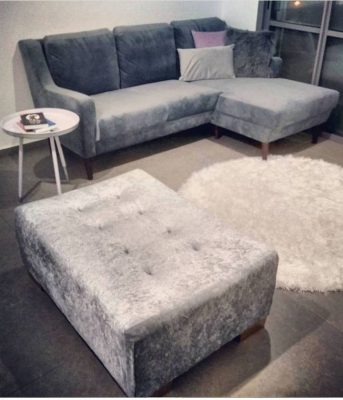 וגם הסלון דרש שדרוג בסטייל קטיפתי. בכלל בד קטיפה משדרג כל רהיט. הוא יוקרתי, ונעים למגע. היה לנו הדום מעור שחור – יפה כשלעצמו, אך הרגשתי שהוא צריך תחפושת חדשה.