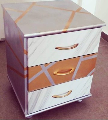 • הגוף עצמו: צבעתי תחילה בצבע זהב, ואחרי ייבוש מושלם הדבקתי רצונות סלוטייפ ליצירת פסים. צבעתי שוב, הפעם בצבע כסף, וקילפתי את הרצועות. במגירה האמצעית עשיתי את אותו הדבר בהיפוך צבעים.
